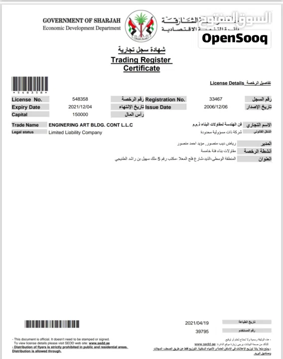 للبيع رخصة تجارية تاسست عام 2006 المحال مقاولات بناء